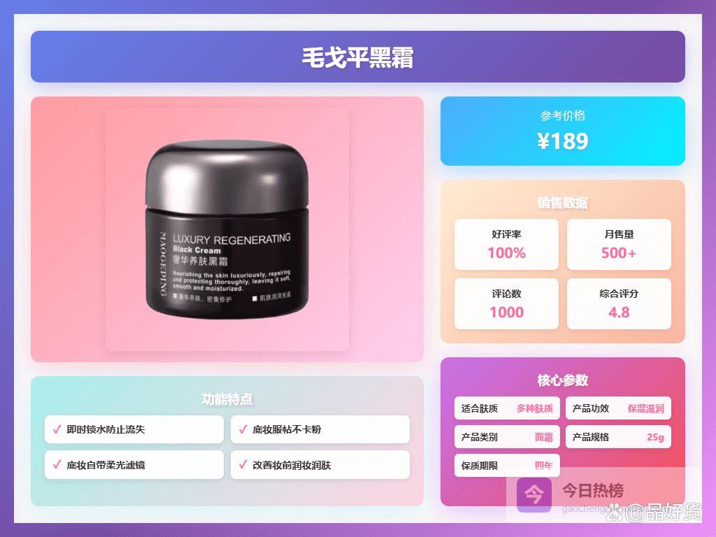 六、毛戈平这款毛戈平黑霜的神经酰胺成分,让肌肤的“水屏障”变得坚不可摧。用起来就像帮肌肤盖上一层隐形盔甲,水分和养分都不跑丢。试了下,吸收速度还算快,润而不粘,拍在脸上像喝了杯清润的果汁,皮肤瞬间变得饱满水润。