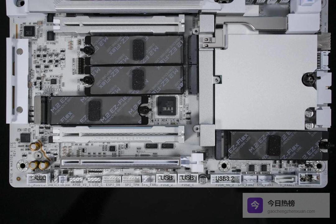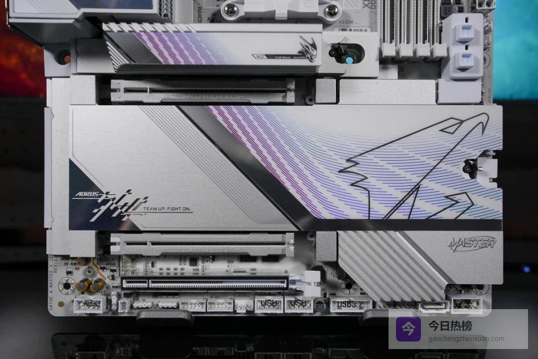 再往下方的大面积金属散热装甲下,则是5条M.2插槽,其中两个支持PCIe 5.0,剩余三个则是PCIe 4.0。技嘉还为其专门设计了全新的M.2弹性底座,可显著改善SSD与导热垫之间的接触,提升散热性能。