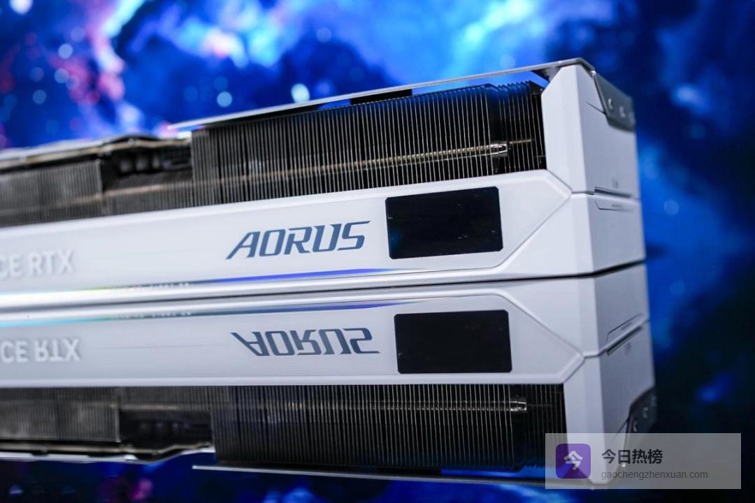 外观设计上,依旧是纯白的配色,和上面提到的两款技嘉产品很搭。正面有棱角分明的边框和风扇边的彩色条纹做装饰,整体给人的印象非常简洁硬朗。侧边的“AORUS”标志旁配备了一块小的显示屏,点亮后除了可以显示一些显卡的运行信息外,还可以显示自定义的文本、图片和GIF。