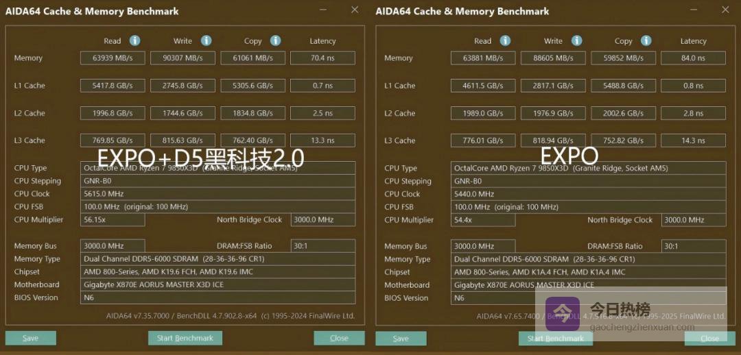 主板采用了18(110A)+2(110A)+2(60A)相供电设计,配备了四条DDR5内存插槽,最高支持9000+MT/s的内存频率。搭配技嘉主板专属的D5黑科技2.0后,我们手头的这两条16GB DDR5-6000MHz内存,在AIDA64中实测到读取速度63939MB/s,写入速度90307MB/s,复制速度61061MB/s,相较不开启D5黑科技2.0前,平均提升了2%,延迟也降低了16%。