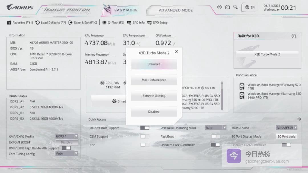 在如此多硬件堆料的基础上,这块技嘉X870E AORUS MASTER X3D ICE上还配备了技嘉独创的X3D Turbo模式2.0。顾名思义,开启该模式后这块主板能进一步提升X3D系列处理器的性能表现,玩家可在三种预设模式——标准、最大性能和极限游戏中任选其一,获得不同幅度的性能提升。