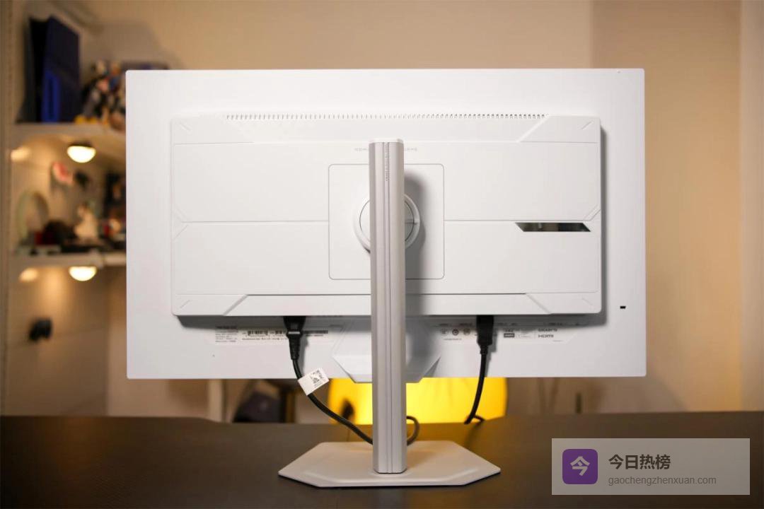 转到背部,也是一体化的纯白设计,表面用了线条纹理和品牌LOGO做点缀,简单利落地彰显其电竞显示器的定位。
