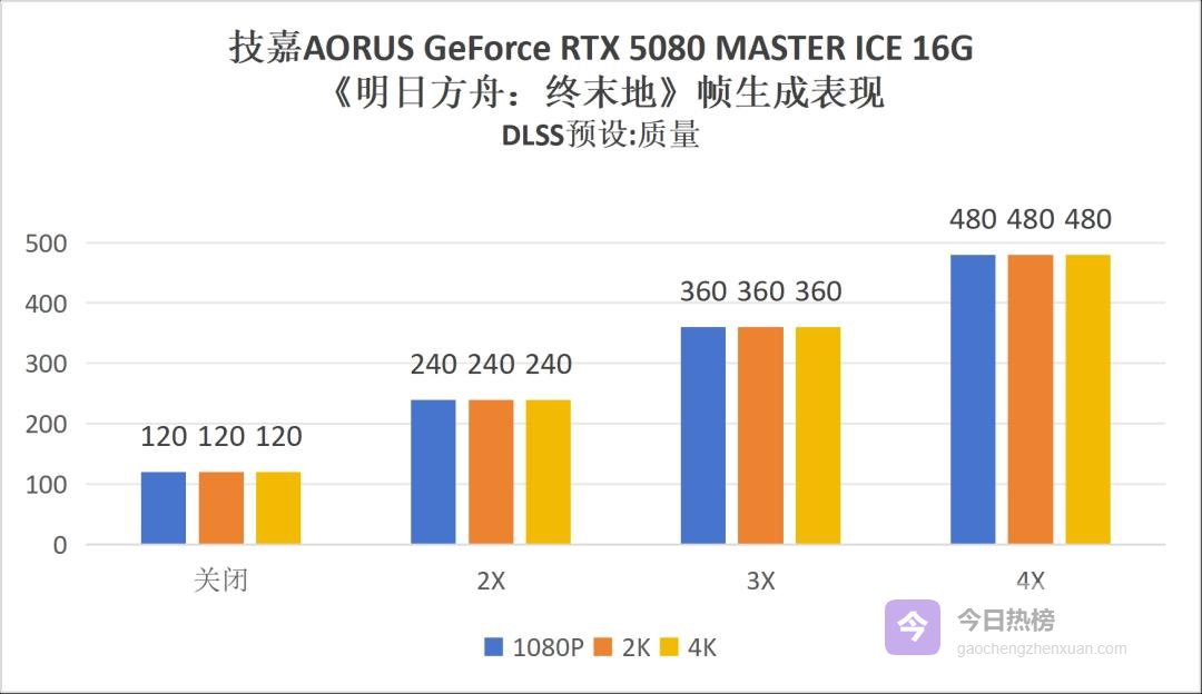 我们也实际测试了《明日方舟:终末地》在这块技嘉AORUS GeForce RTX 5080 MASTER ICE 16G显卡上的运行表现。但就像上面提到的,这块显卡的性能对《明日方舟:终末地》这样的二游来说绝对是溢出的,即便你在游戏中搭建了极为复杂的自动化项目,画面上同时有十多条生产线在运作,游戏画面也不会出现任何卡顿发热情况。我们测试了其在1080P、2K、4K分辨率下,开启最高画质和DLSS“质量”模式后,分别在关闭DLSS帧生成和开启2倍、3倍、4倍帧生成的情况下,游戏中角色跑图的帧数表现,结果就是每次都能稳定跑满游戏在不同帧生成档位下的帧数上限,完全没有任何负载压力。