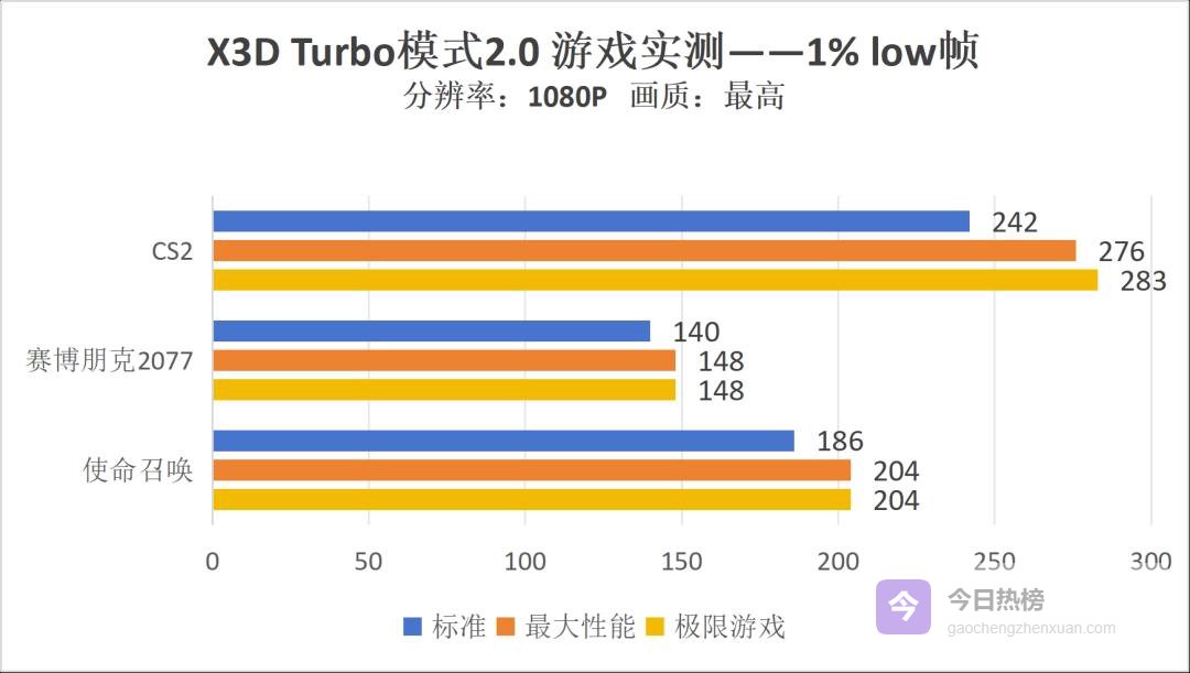 不难看出,对比标准模式下的测试成绩,几款游戏在开启X3D Turbo模式2.0的“最大性能”模式后,游戏的平均帧数和1% low帧均得到显著提升,提升幅度平均为3.6%和10%,而切换到“极限游戏”模式后,再度提升的幅度虽不大,但在CS2中,提升依旧能达到十帧左右。考虑到这些高强度竞技FPS游戏对帧数和画面流畅度都有着很高的要求,有了X3D Turbo模式2.0的加持,显然能让玩家们的每次射击都更有底气。