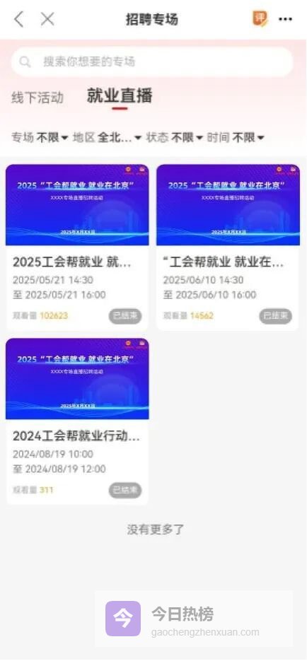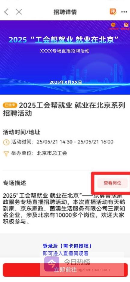 【首页】点击【就业服务】,点击轮播图或【就业直播】后,选择相应场次,点击【立即前往】,登录后(需卡包授权),即可进入直播间观看。