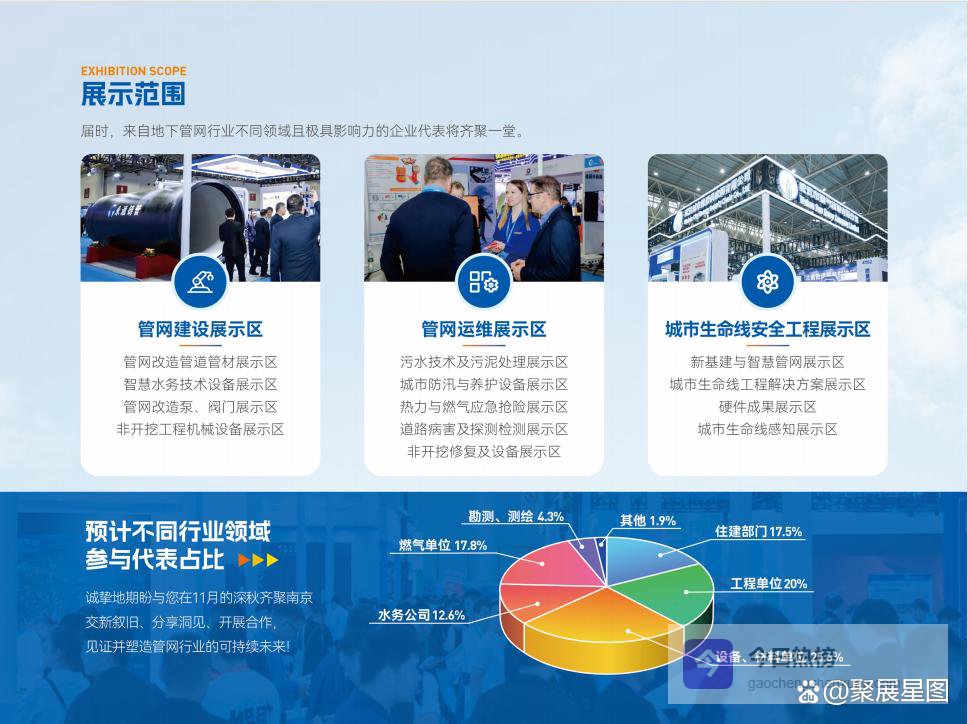 双展联动、全链布局是本届展会的核心特色,两大主题展会协同发力,全面覆盖城市管网与安全工程建设的每一个关键环节,构建起“产品展示-技术交流-方案落地-合作共赢”的完整生态。其中,南京国际管网展览会聚焦管网全生命周期,涵盖上游管材管件、管网原材料,中游管网施工设备、检测设备、修复设备,下游管网运维、智慧管控系统及管网改造解决方案,全方位展示地下管网“一张图”体系建设、管网数字化改造、泄漏监测等前沿成果,贴合国家对市政基础设施智能化升级的要求。城市安全工程建设展览会则重点覆盖城市排水防涝、燃气安全、建筑安全、应急救援、智能安防等领域,集中展示城市安全监测设备、应急处置装备、安全防护材料及一体化安全解决方案,助力补齐城市安全短板。
