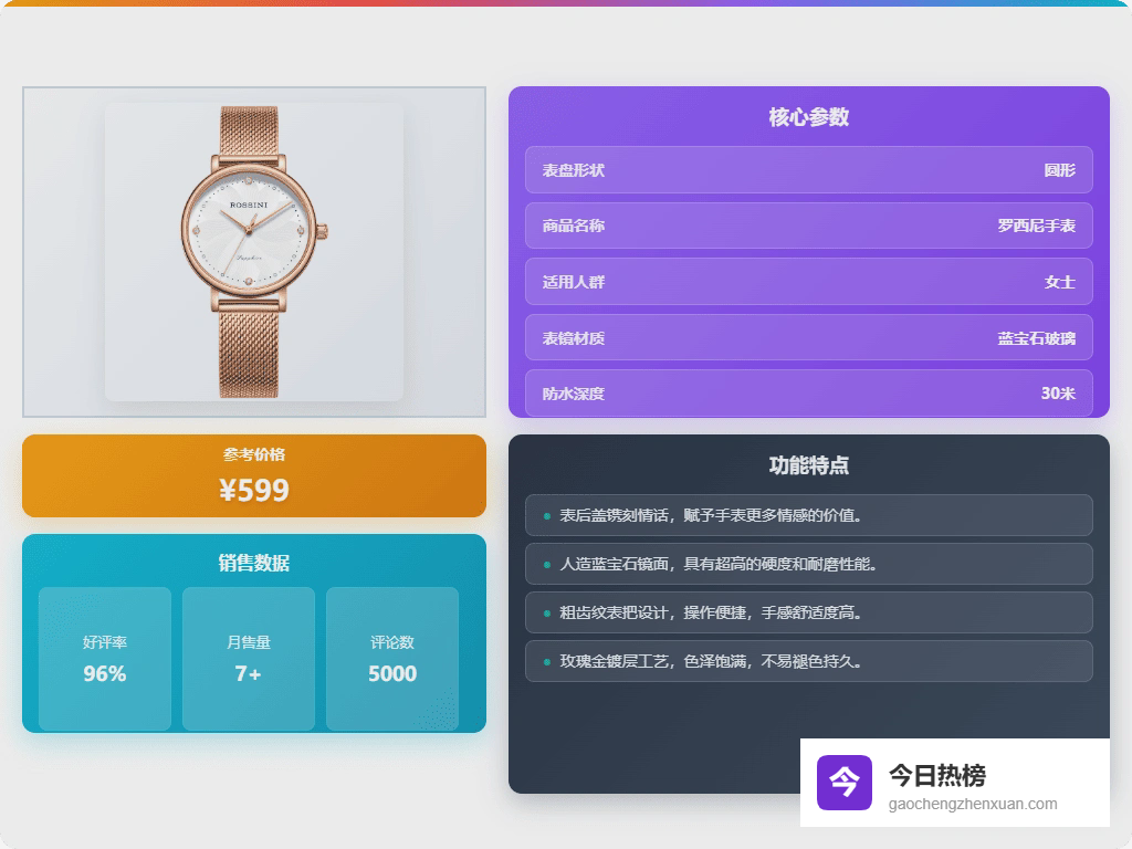 七、上海参数:石英机芯、迷你表盘、蓝宝石玻璃、镶钻装饰、防水3巴