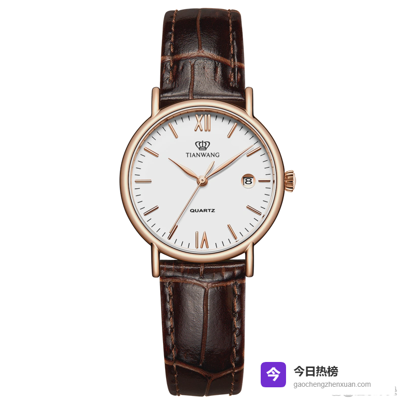 九、天王参数:玫瑰金色大三针、不锈钢材质、圆润表圈、单历显示、皮质表带