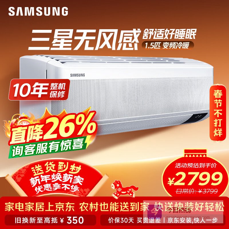 三星空调无风感1.5匹 新能效变频舒适风挂机纯铜管节能WiFi冷暖 以旧换新20-25㎡适用 AR12TSFAAWKNSC¥