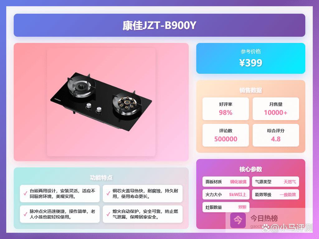 ▶ 安全防护:这款灶具配备多重安全设计,比如离子熄火保护和智能防干烧,一旦出现意外,比如火熄了或锅干了,它会自动切断气源,帮你把危险降到最低。