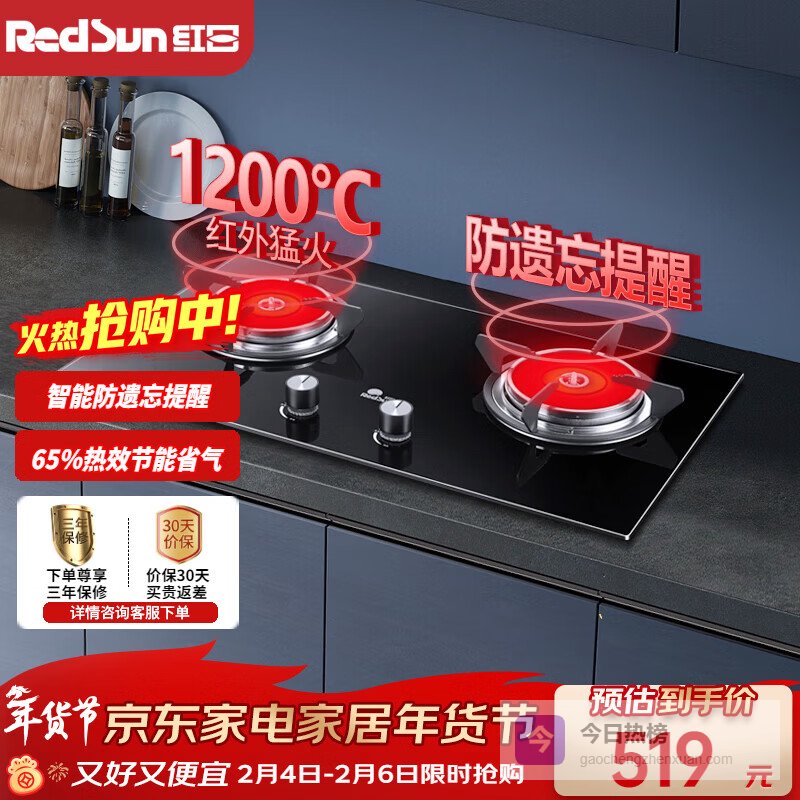 红日(RedSun)红外线燃气灶60分钟固定定时防遗忘煤气灶双灶具天然气液化气家用猛火灶不锈钢/钢化玻璃EM208B/G EM208B 多重防爆钢化玻璃面板 液化气¥