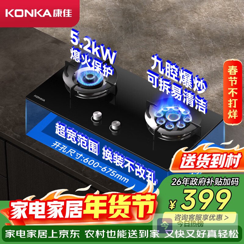 康佳(KONKA)燃气灶煤气灶双灶具家用 5.2kW文武双全火九腔鸳鸯灶式嵌入式 钢化防爆 JZT-B900Y(Y)(天然气)¥