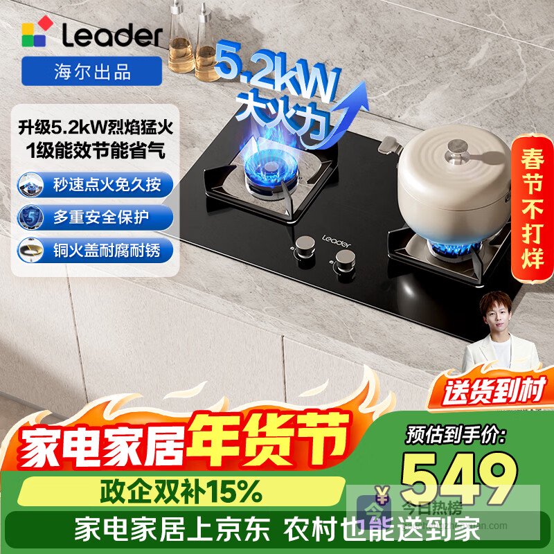 海尔(Haier)统帅出品 家用天然气灶 国家补贴 5.2KW大火力钢化玻璃台嵌两用 上门安装铜合金火盖煤气灶双灶L2C¥