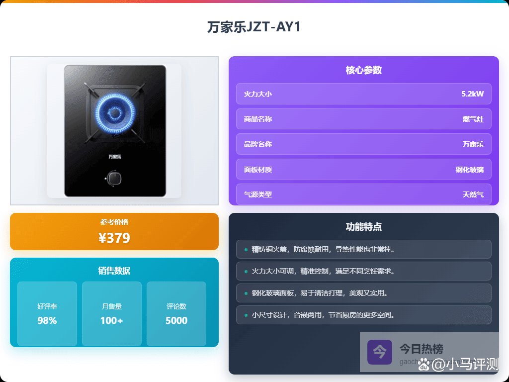 八、万家乐▶ 大火力满足烹饪需求:搭载5kW及以上的大火力,倒是可以轻松应付各种烹饪方式,比如炒菜、煎烤、煮汤都很顺手,火力够大,出锅速度快,做饭更省时间。