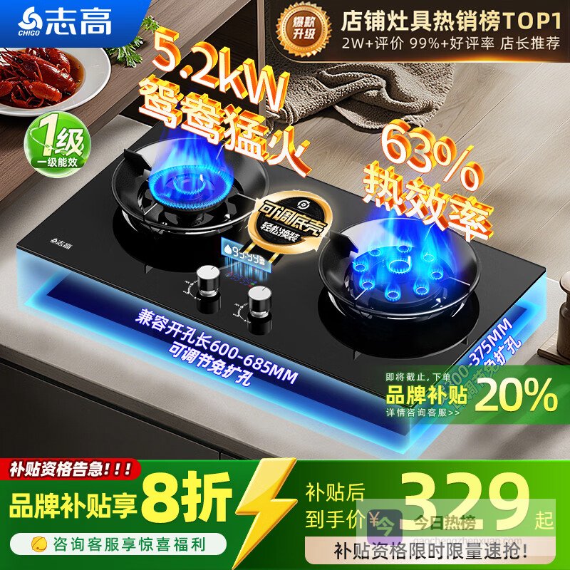 志高(CHIGO)燃气灶天然气液化气灶煤气灶家用猛火5.2kw双灶一级能效节能省气灶具台嵌两用厨房免开孔 品牌补贴 【高配升级】钢化玻璃+鸳鸯猛火+定时防烫+聚能环 管道天然气丨5.2kW¥