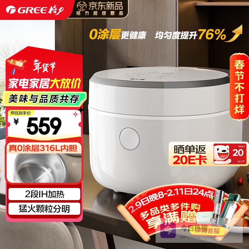 【京东自营】格力电饭煲家用2-3-4人电饭锅真0涂层316L不锈钢内胆3L小型IH加热多功能煮粥柴火¥