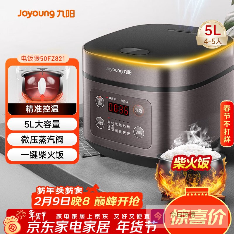 【京东自营】九阳5升大容量4~5人家用智能微压电饭煲电饭锅大火力柴火饭多功能焖煮不粘内胆方煲50FZ¥