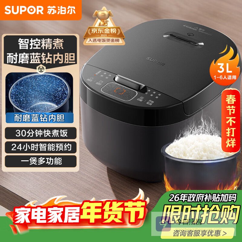 【京东自营】苏泊尔小电饭煲2-3人3升蓝钻不粘内胆家用电煮锅煮饭煮粥智能预约多功能一锅多用小型微压电¥