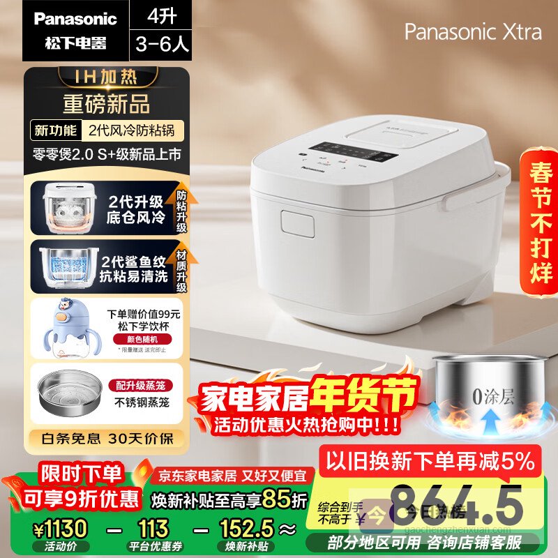【京东自营】松下【国家补贴】Xtra零零煲2.0电饭煲0涂层家用电饭锅4-5人IH无涂层不锈钢4升一¥