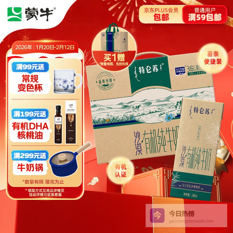 【京东自营】蒙牛特仑苏沙漠有机纯牛奶250ml*12盒精美年货礼盒¥