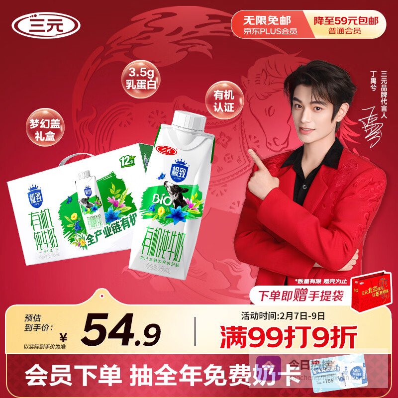 【京东自营】三元极致有机纯牛奶整箱250ml*12盒梦幻盖年货礼盒¥