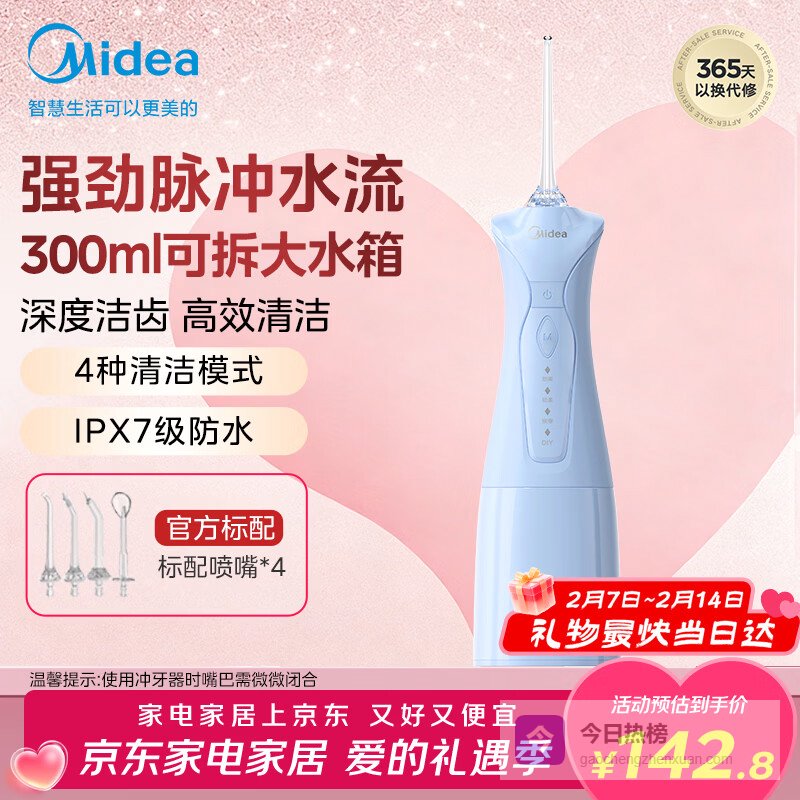 美的(Midea)冲牙器 牙齿牙缝口腔清洁 家用便携式电动水牙线 MC-BJ0102正畸喷嘴海盐蓝年货节情人节年会礼物¥