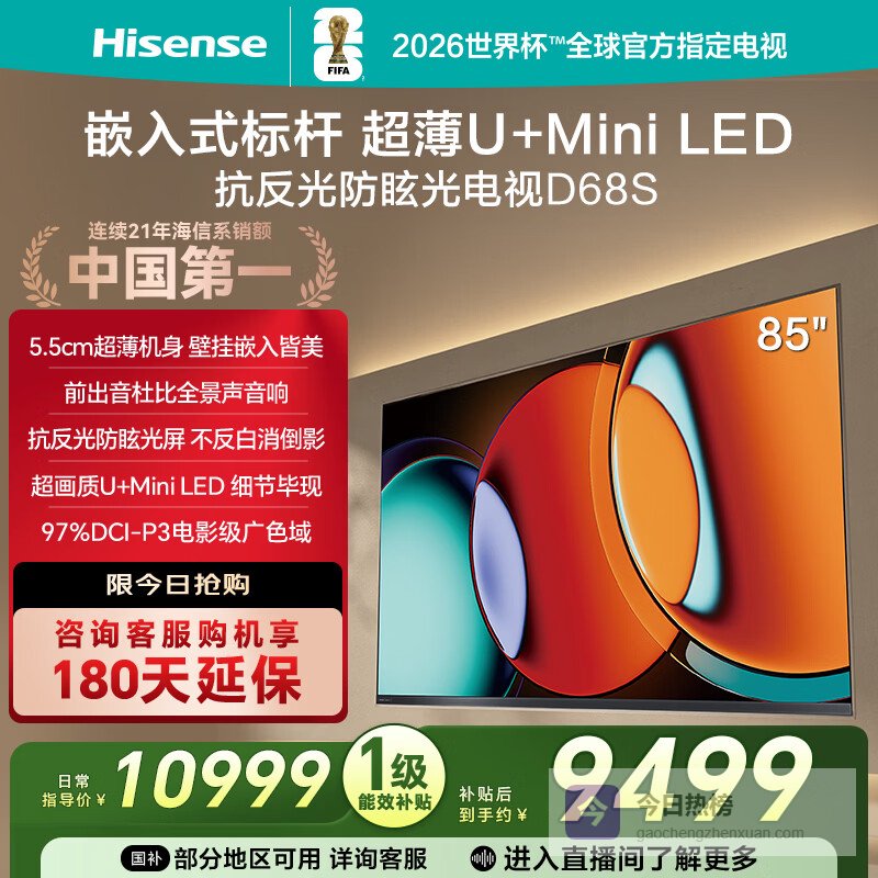 海信电视D68S 85英寸 超薄贴墙 前出音杜比全景声 抗反光防眩光 U+MiniLED 电影级广色域 264Hz¥
