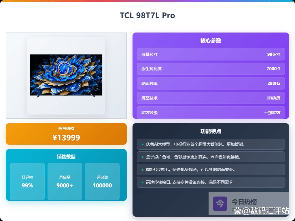 二、TCL这款TCL 98T7L Pro搭载QD-Mini LED技术,能够带来更高亮度和更加鲜明的色彩表现。蝶翼星曜屏设计不仅提升屏幕的整体显示效果,还能实现超广视角,让坐在不同位置都能轻松享受细腻画面。配合华星高端HVA屏,原生对比度达到7000:1,画面层次感更丰富。