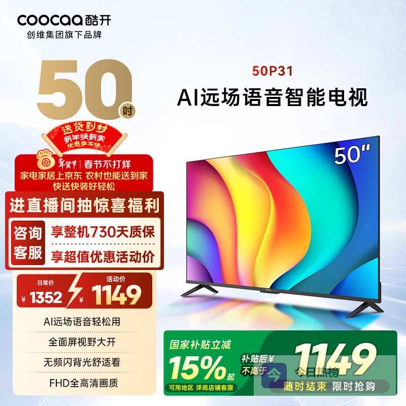 酷开经济款 创维 P31系列 50英寸 全高清超薄全面屏 节能护眼智慧屏 平板游戏液晶电视机以旧换新50P31¥