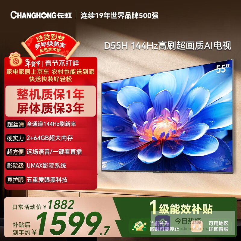长虹经济款 长虹电视55D55H 55英寸4K超高清 144Hz高刷 2+64GB大内存 LED液晶平板电视机 国家补贴15%¥