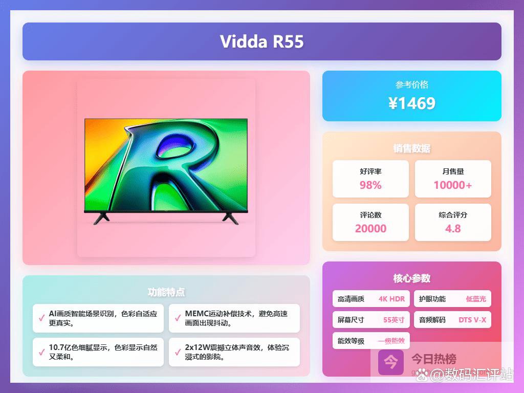 哪个品牌电视好,值得买型号推荐一、Vidda这款Vidda R55平板电视提供了4K超高清画质,支持HDR和MEMC运动补偿技术,确保高速运动画面不会模糊或抖动。它采用高色准调校,展现自然细腻的色彩,色彩表现超过了普通电视。AI画质识别还能根据不同场景自动调节最佳画面效果,体验挺真实的。