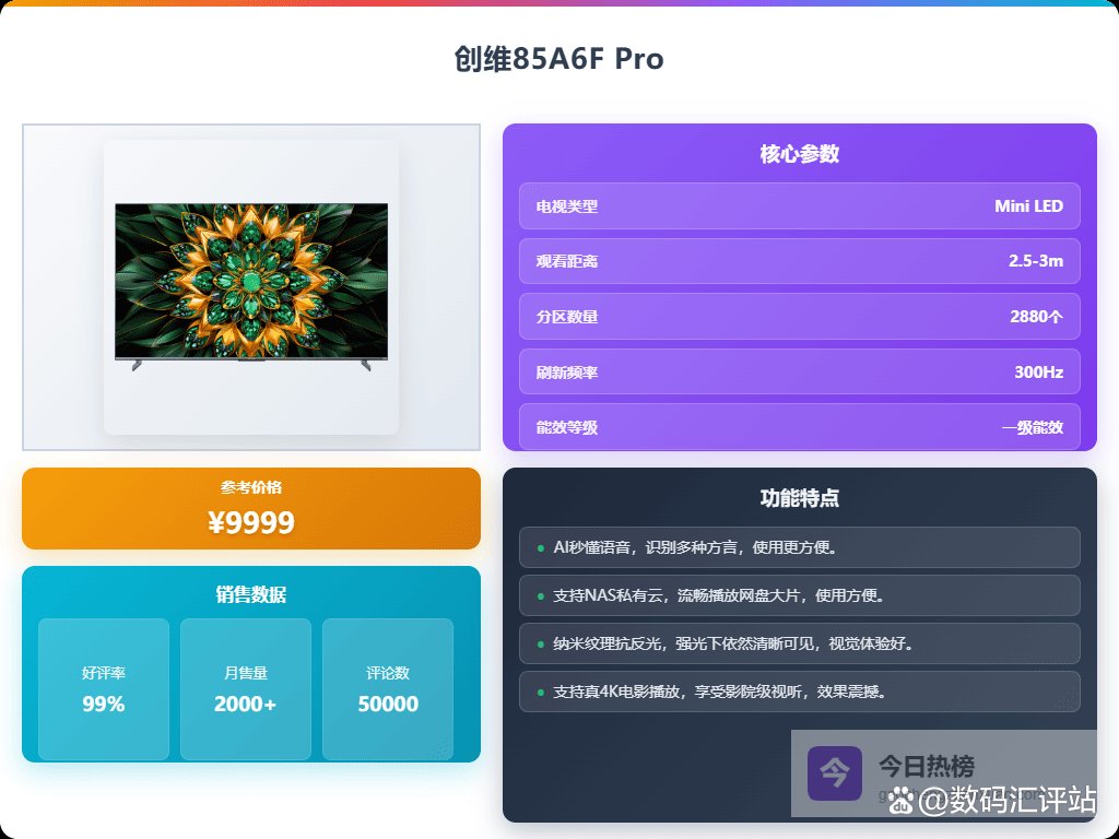 五、创维这款创维85A6F Pro配备了2880分区的QD-Mini LED技术,能够实现像素级别的精准控光,让画面的黑色更深邃、对比更明显。结合超高的亮度和高刷新率(300Hz),无论是快速运动的画面还是暗场细节,都能呈现得比较细腻流畅,体验挺自然的。