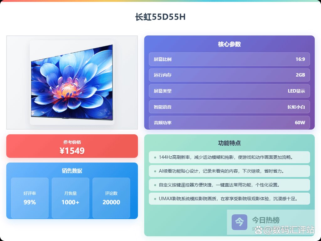 八、长虹这款长虹55D55H支持144Hz超高刷新率,能带来更顺畅的画面表现,特别是在看动作片或玩游戏的时候,画面几乎没有拖影,体验感还行。配合MEMC运动补偿技术,即使快速运动的场景也能减少模糊,让画面更清晰锐利。