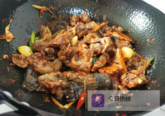 热锅凉油,下冰糖小火慢炒,待泡沫由大变小、颜色呈浅褐色,立即倒入沥干后的甲鱼块,大火快炒,让每块都裹上糖色。1分钟后加入姜蒜葱辣椒继续翻炒,出香后再加生抽提鲜、老抽上色。