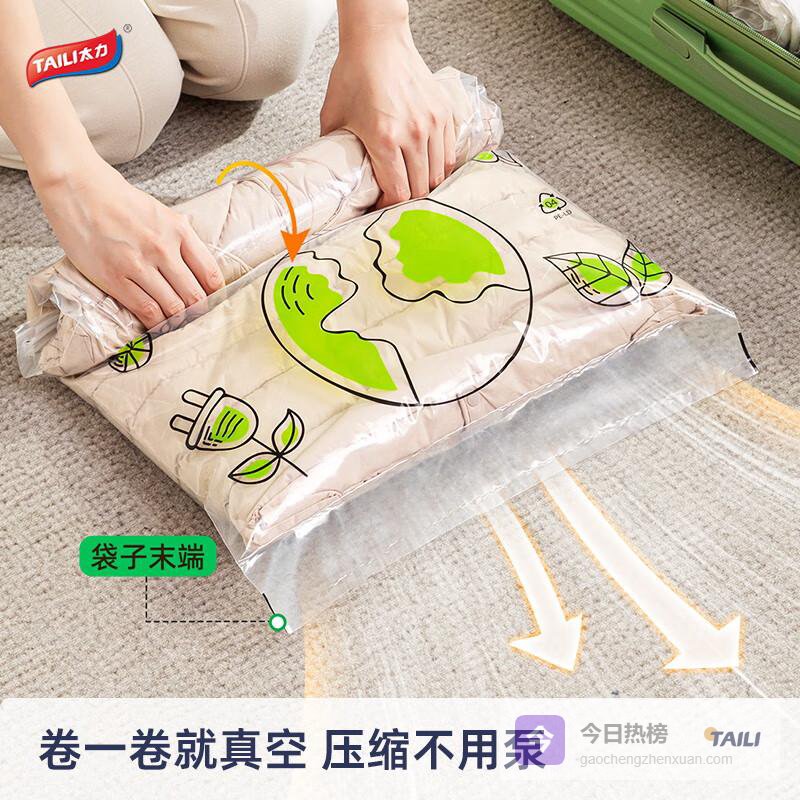 1️⃣ 免抽气黑科技,告别笨重工具 传统压缩袋需要搭配抽气泵使用,而太力的双排气通道设计,只需跪压或卷压就能排气。实测装满衣物的袋子,跪压3次就能达到接近真空的状态,比用泵还快10秒。出差住酒店时尤其方便——没有电源也能快速压缩回程行李。