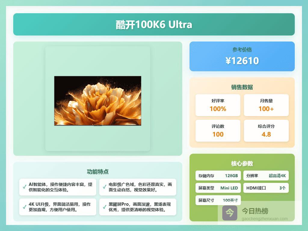 选酷开电视,首先得看你的预算和需求。如果追求极致的画质和观影体验,那100K6 Ultra绝对是首选,Mini LED背光技术加上4000nits的峰值亮度,简直就是一台家庭影院!当然,价格也相对较高。如果预算有限,又想体验高刷,那K3系列就很香了,144Hz高刷看电影打游戏都流畅到飞起。还有,别忘了关注尺寸,根据客厅大小选择合适的尺寸才能获得最佳观影效果。总之,选购酷开电视,明确需求最重要,这样才能选到最适合你的那一款。像我就挺注重护眼模式的,毕竟每天都要看电视,对眼睛好点才是真的。