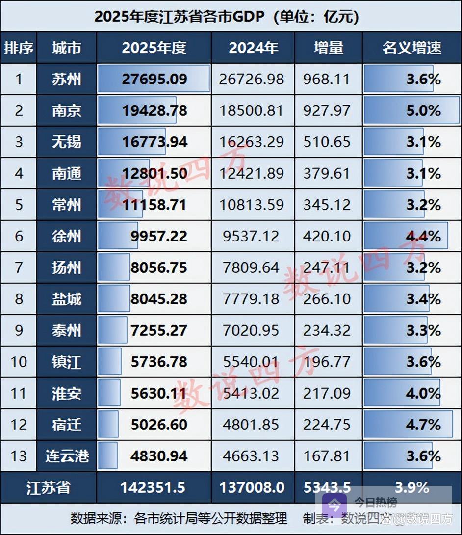 江苏省13个城市2025年全部实现了GDP大涨,且全部进入了全国百强,多个城市取得了明显的进步,实现了千亿量级突破,唯一遗憾的就是,徐州没有如愿跻身万亿GDP城市阵营。