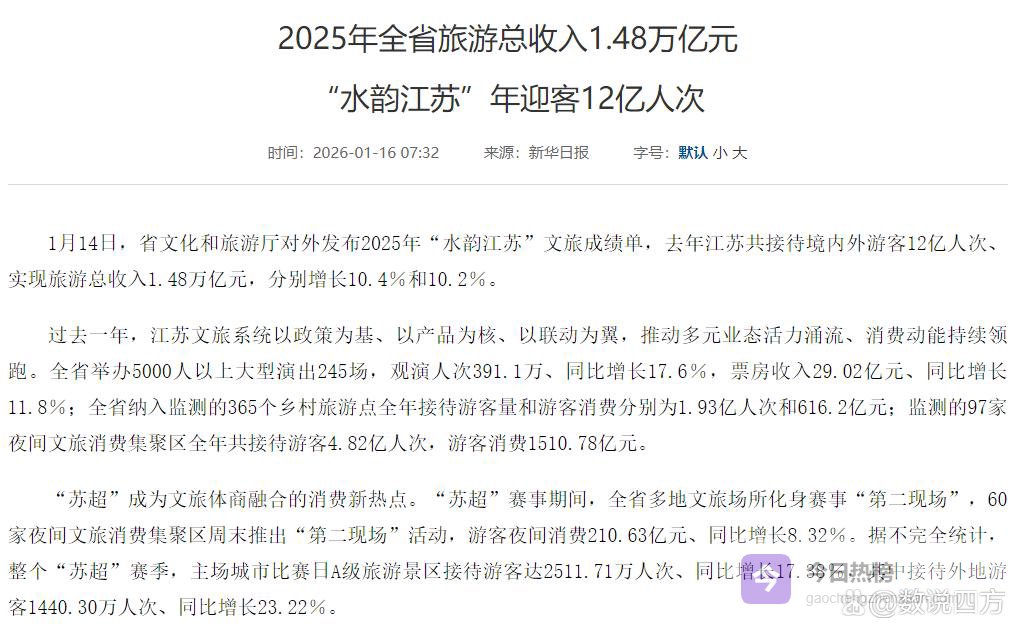 江苏省本就是一个旅游大省,再加上2025年的“苏超”爆火,让文旅产业的增长更加惊艳。2025年,江苏省共接待游客12亿人次,同比增长10.4%;实现旅游总收入1.48万亿元,同比增长10.2%。不说游客数量及旅游收入体量,单就这两个10%的增速,全国也是屈指可数。