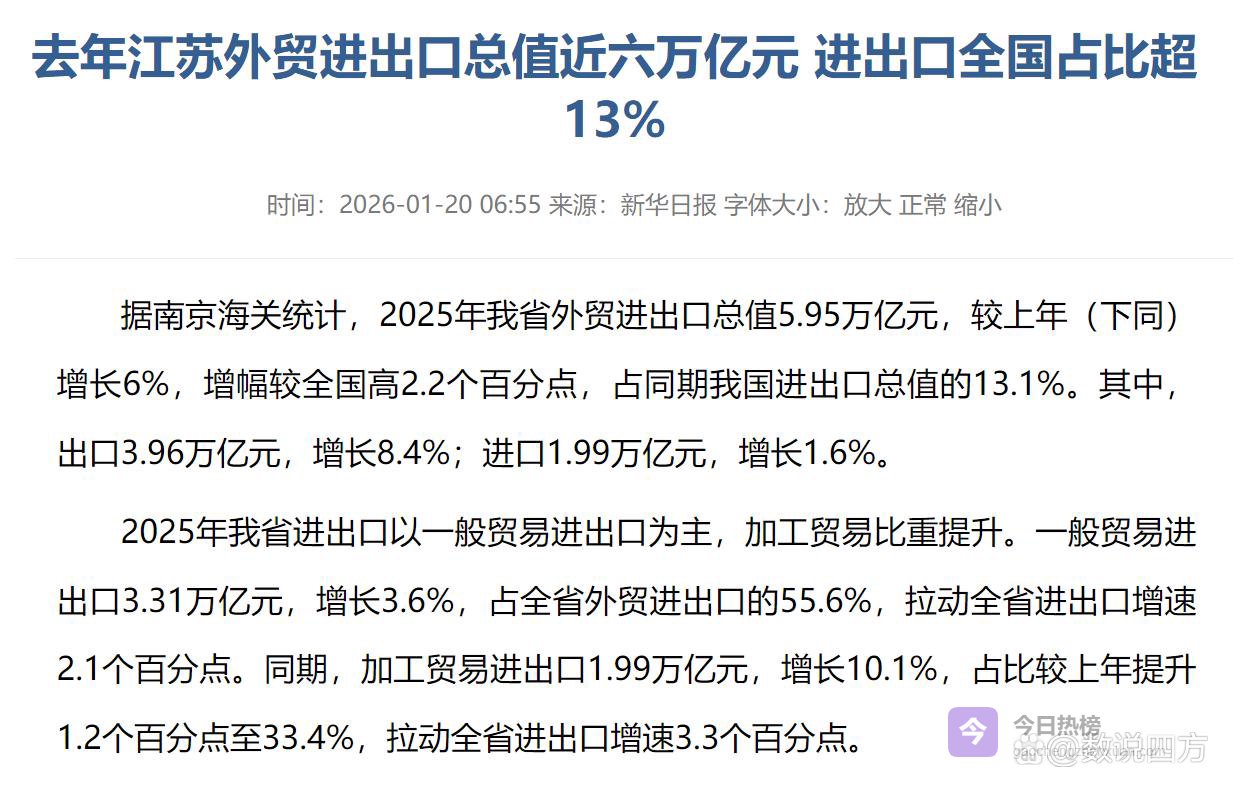 2025年江苏省进出口总值5.95万亿元,同比增长6%,外贸规模稳居全国第二位,外贸增速是粤苏鲁浙京沪六个外贸大省中最高的,外贸表现非常出色,是江苏省经济增长的重要动力。其中,出口3.96万亿元增长8.4%,进口1.99万亿元增长1.6%,出口及其增速远高于进口及其增速。