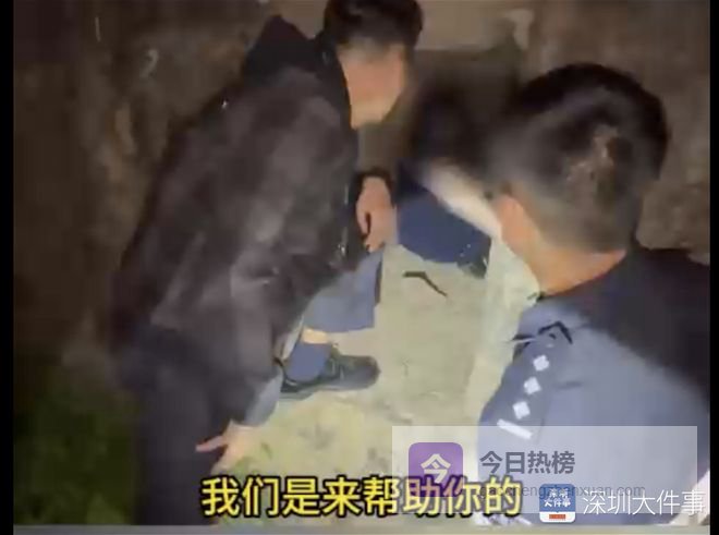 女子蜷缩在石洞内,民警正在耐心安抚其情绪(视频截图)