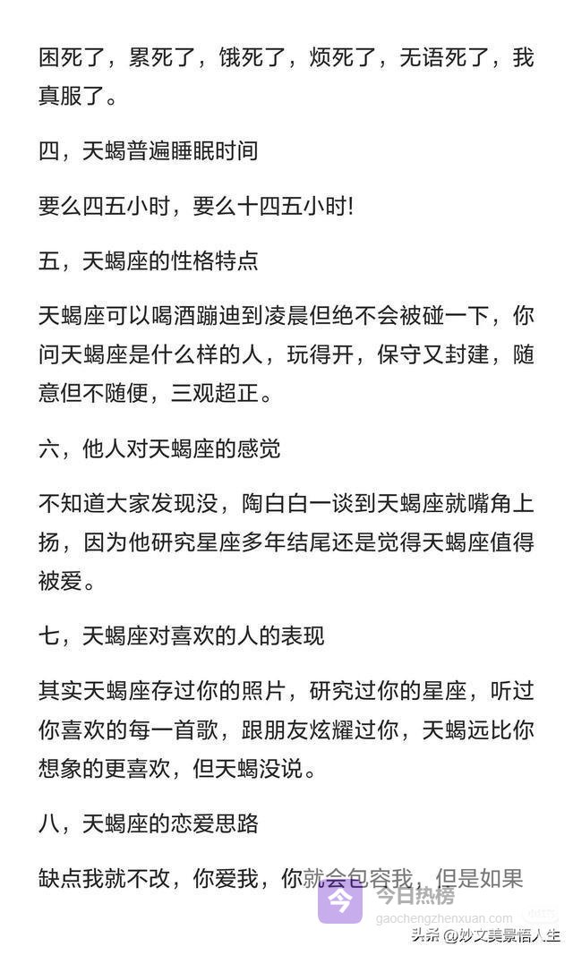 天蝎座的人生,没有中间地带。这篇笔记里“要么四五小时,要么十四五小时”的睡眠时间,就是这种极端能量模式的最好注脚。他们要么极度活跃,要么极度静止;要么极度投入,要么极度抽离。这种“不疯魔不成活”的特质,让他们在工作和生活中都能爆发出惊人的能量。他们三观极正,追求圆满,并且因为凡事追求结果,常常选择亲力亲为。但同时,他们内心深处又藏着一种对失控的恐惧,总是会做好最坏的打算,这让他们在感情中既热烈又擅长冷暴力,明明内心喜欢得要命,出口却可能伤人。