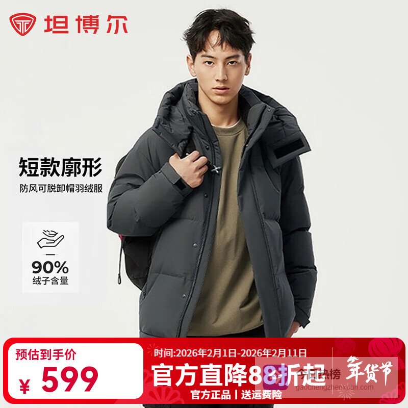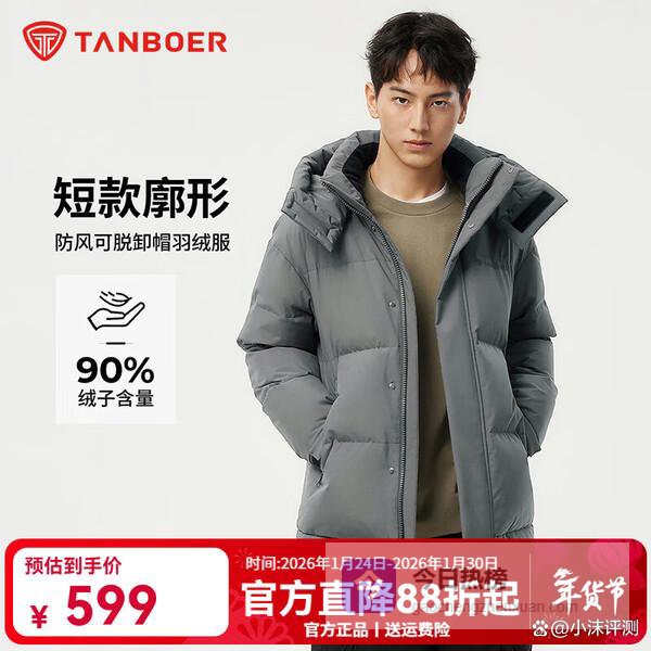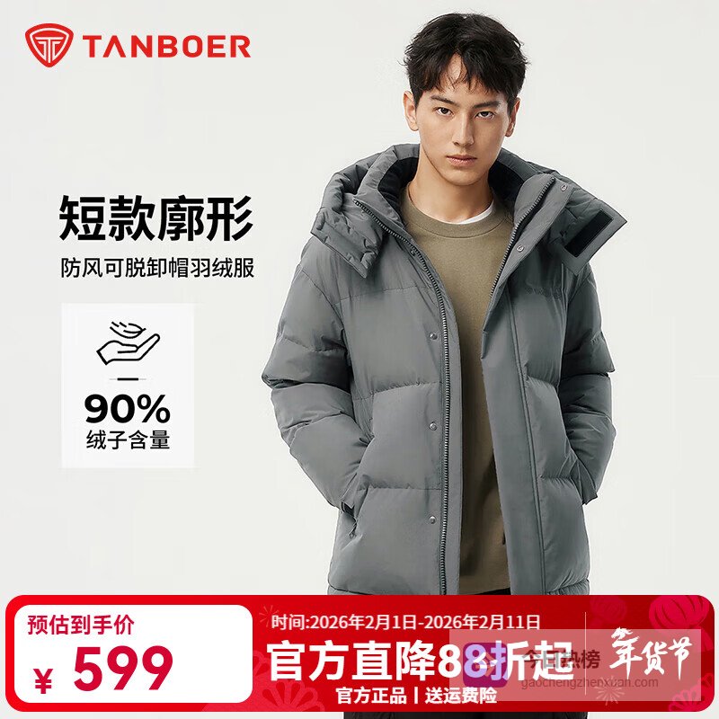 坦博尔(Tanboer)2025新款防风可脱卸帽羽绒服男短款户外休闲秋冬厚外套 青砂石 XL (180) 建议体重140斤-160斤¥
