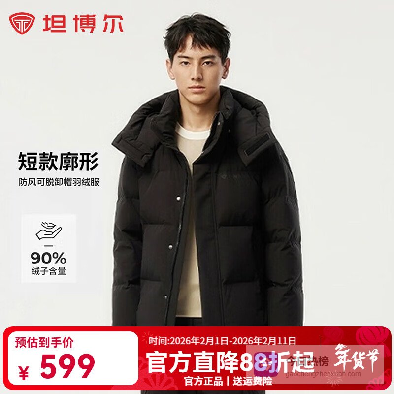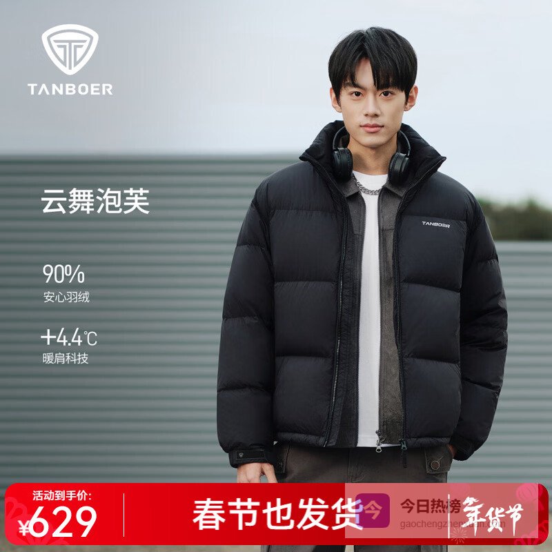 坦博尔(Tanboer)2025新款防风可脱卸帽羽绒服男短款户外休闲秋冬厚外套 黑色 L (175) 建议体重120斤-140斤¥