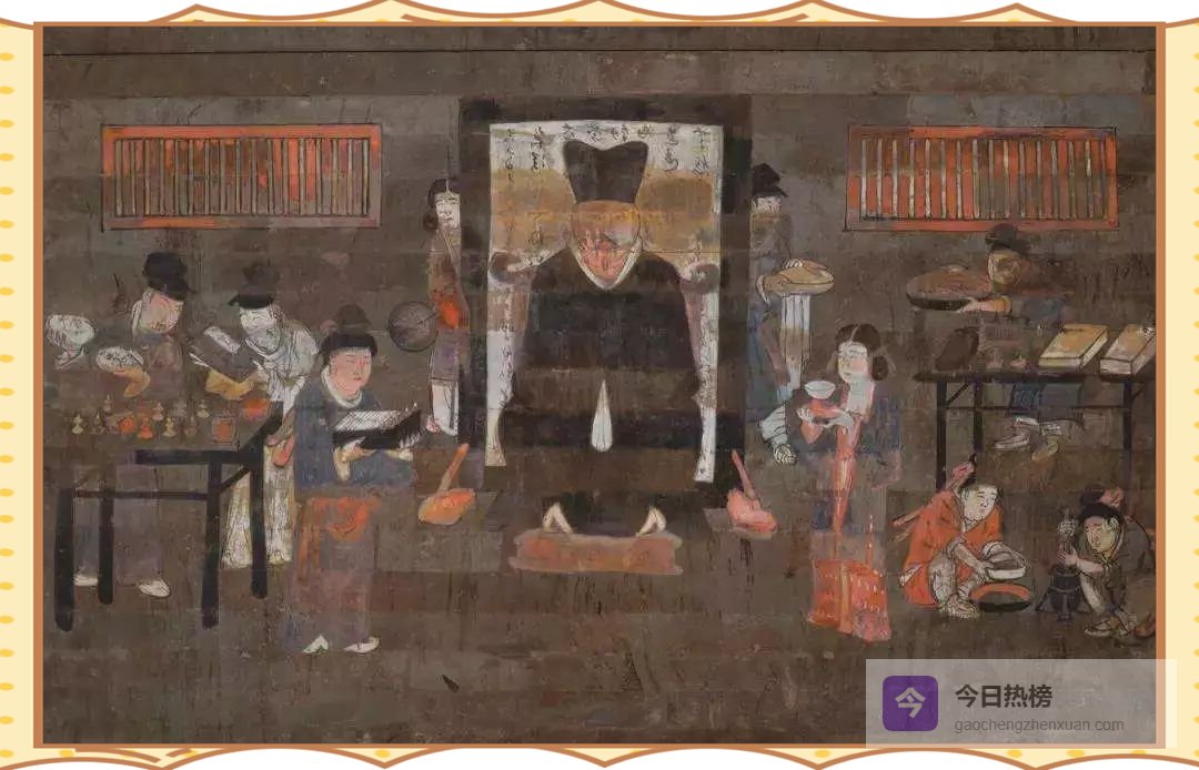 正中草书屏风前,男墓主端坐;左侧方桌旁,一人执“大黄”,一人执“白术”,两包药材已褪去泥土与杂质;右侧三人或翻《太平圣惠方》,或捧成药盒,盒上“朱砂丸”三字赫然在目。最妙的是背景——侍者端水送药,一条完整炮制线被定格在方寸之间。
