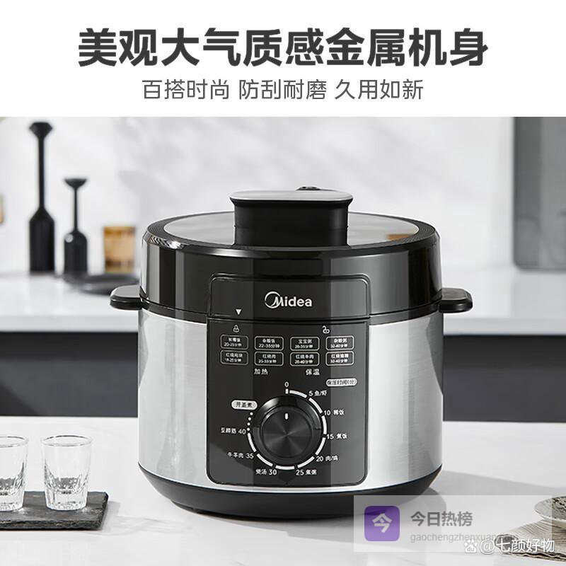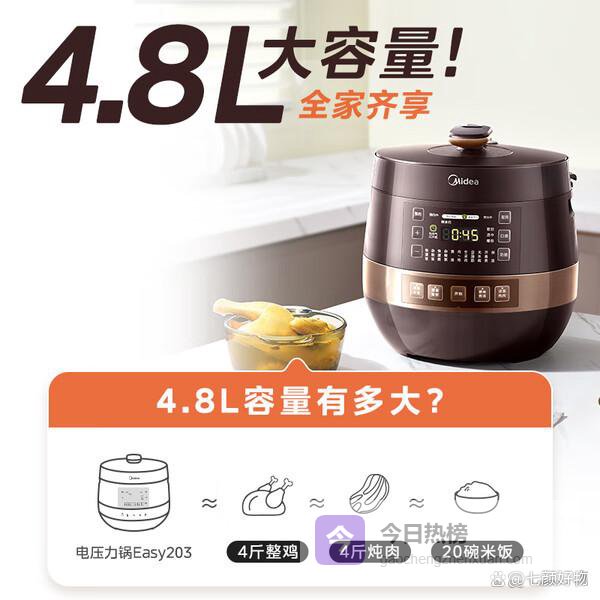 推荐理由:美的这款电压力锅容量有5升,家里4-6个人吃饭完全够用,平时炖个肉、煲个汤啥的,一次就能搞定,不用分批做,省事儿!