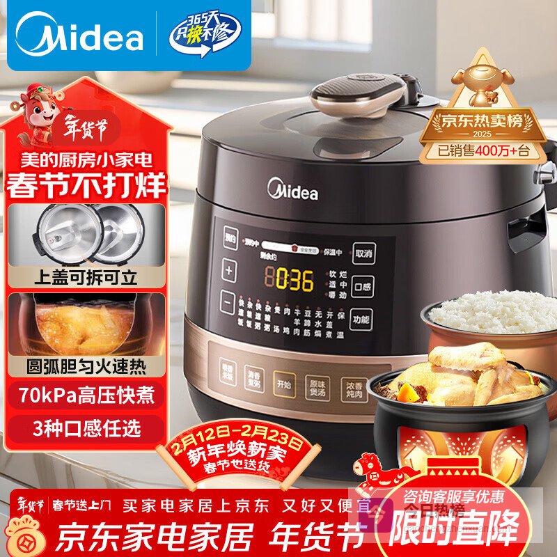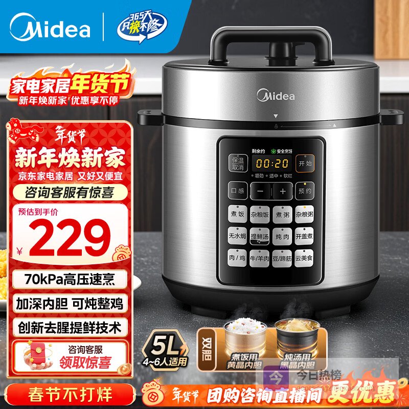 美的(Midea)家用5升高压锅电压力锅4-5-6-8人 加深双内胆高压电饭锅电饭煲 电高压锅多功能炖肉专用煲汤锅年货 【高压快炖 配加深双内胆】 5L (约20碗)¥