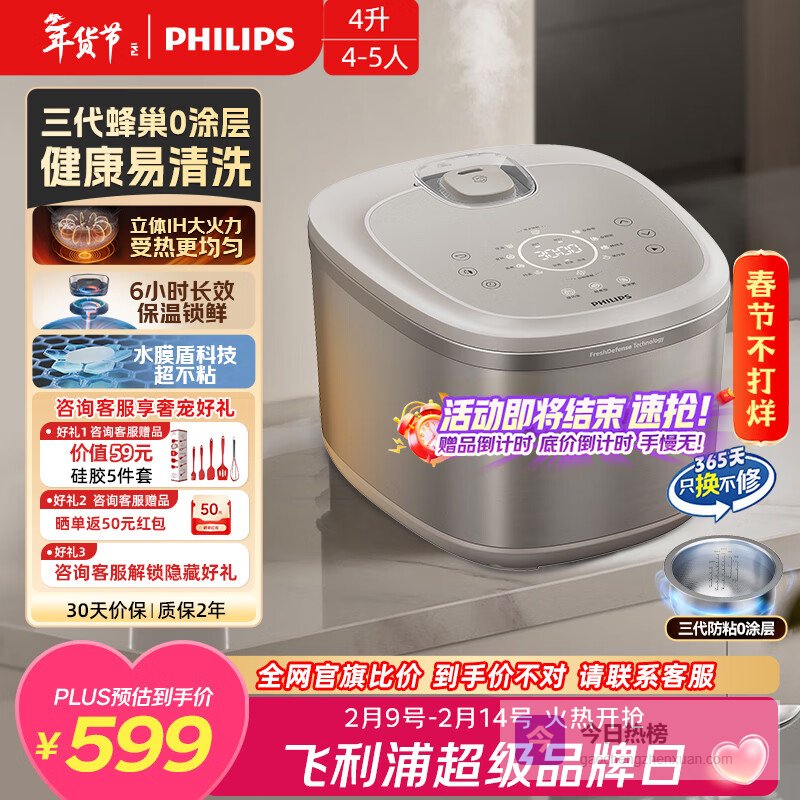 飞利浦(PHILIPS)电饭煲0涂层IH加热4L家用升级鲜润面膜饭0涂层不粘锅电饭煲4-5人 HD5225 新年礼物送礼¥
