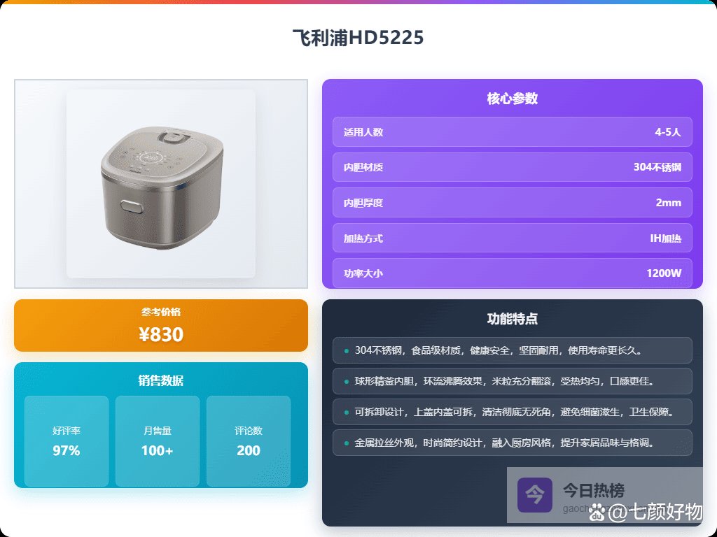 第1款:飞利浦HD5225参数:容量4L、额定功率1200W、内胆材质304不锈钢、加热方式IH、内胆厚度2mm