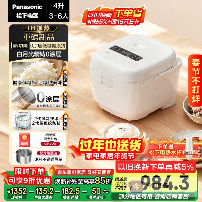 松下(Panasonic)【国家补贴】白月光低糖电饭煲0涂层IH家用无涂层电饭锅4-5人不锈钢一级能效4升SR-HJSL151-W¥