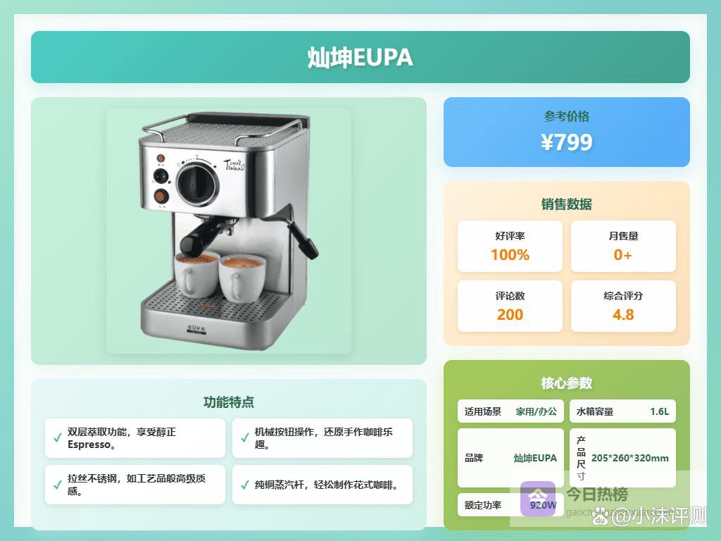 然后,再说说咖啡机本身。萃取压力是影响咖啡口感的关键因素。一般来说,15Bar以上的压力才能萃取出比较浓郁的咖啡。像灿坤EUPA这种有19Bar压力泵的,或者STARSEEKER这种可以调节压力的,就能让你在家也能喝到接近专业咖啡馆品质的咖啡。此外,研磨功能也很重要。如果你喜欢自己磨豆子,那BRUNO这种自带研磨功能的就比较方便。当然,如果你比较懒,或者对咖啡要求不高,那Nespresso这种用胶囊的也OK,省事儿。总之,根据自己的需求和预算,选择最适合自己的那一款就对了!